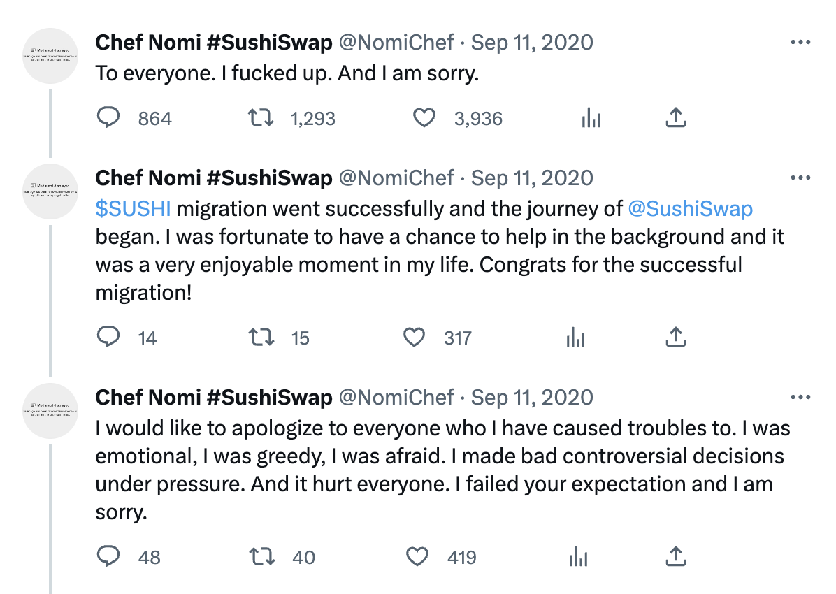 The saga took a dramatic turn when the founder of SushiSwap, Chef Nomi, was implicated in insider trading allegations. He had reportedly sold a large quantity of SUSHI tokens right after the platform’s launch. Like many other web3 projects, the SUSHI tokens were accessible to Chef Nomi before being released to the public, thus giving him an unfair advantage over other investors.
